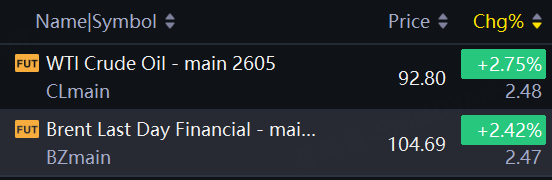 Brent oil futures rose 2.42% to 104.69 a barrel; WTI crude oil futurs jumped 2.75% to 92.8 a barrel.
