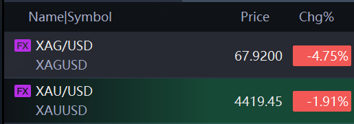 Spot silver fell 4.75% to $67.92 per ounce; spot gold fell 1.91% to $4,419.45 per ounce.