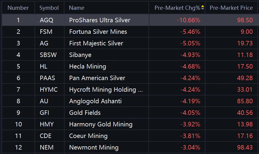 Precious metal shares & ETFs slid in premarket trading. AGQ tumbled over 10%; FSM, AG, Sibanye down around 5%; Hecla Mining, Pan American Silver, HYMC, Anglogold down over 4%.