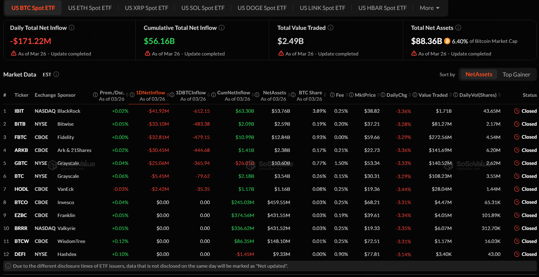 The Bitcoin spot ETF with the highest net outflow on March 26 was iShares Bitcoin Trust (IBIT), with a net outflow of $41.92 million, according to SoSoValue.