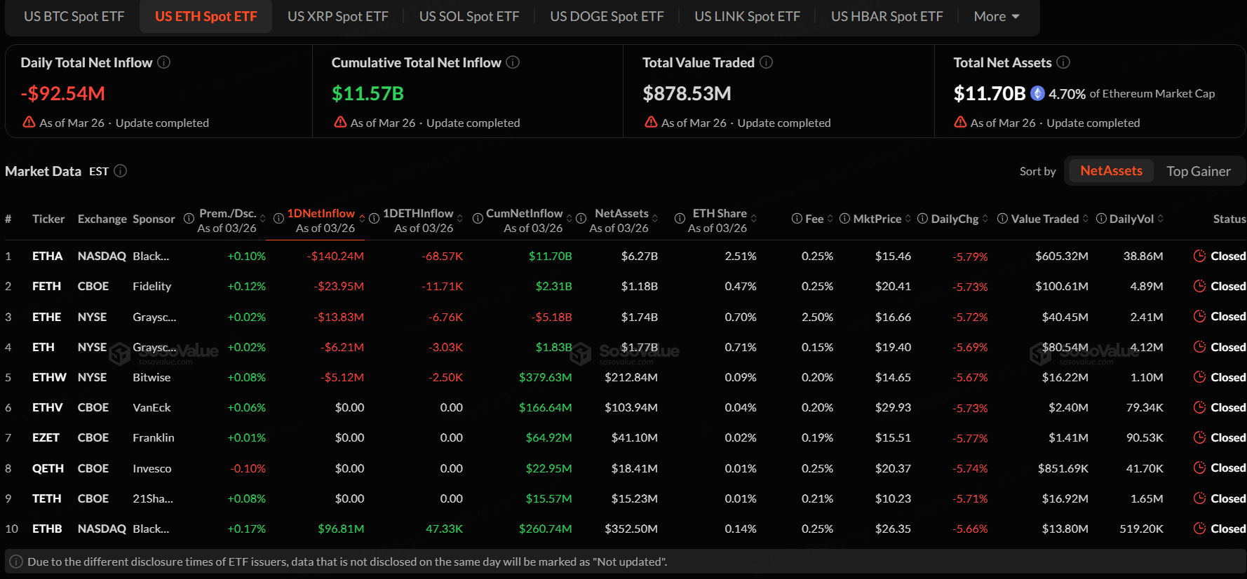 The Ethereum spot ETF with the highest net outflow on March 26 was iShares Ethereum Trust ETF (ETHA), with a net outflow of $140.24 million, according to SoSoValue.