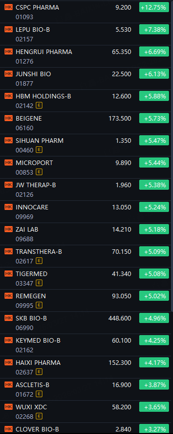 HK Pharma Stocks Gained. CSPC Pharma Up 13%; Lepu Bio Up 7%; Hengrui Pharma And Junshi Bio Up 6%; HBM, Beigene, Sihuan Pharm Up 5%
