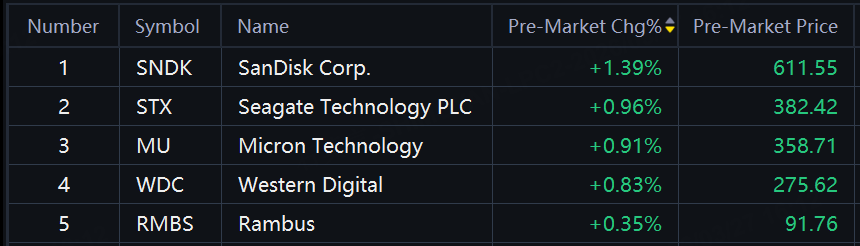 Storage shares rose in premarket trading. SanDisk, Seagate Tech, Micron up around 1%; Western Digital up 0.83%.
