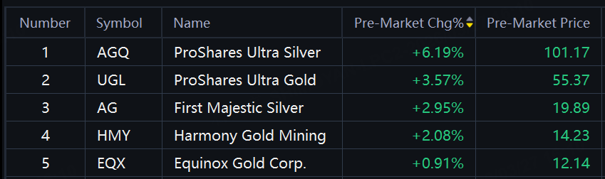 Precious metal shares and ETFs jump. AGQ up over 6%; UGL, AG up around 3%; Harmony Gold up 2%.