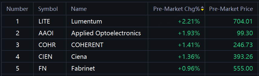Optical communications shares jumped in premarket trading. Lumentum, Applied Optoelectronics up around 2%.