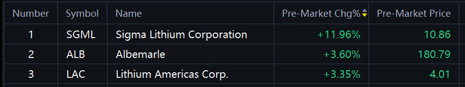 Lithium stocks jumped in premarket trading. Sigma Lithium up 12%; Albemarle, Lithium Americas up over 3%.