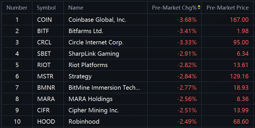 Crypto shares fell as bitcoin dropped below $67K. Coinbase, Bitfarms, Circle, SharpLink Gaming, Riot Platforms, Strategy down around 3%.