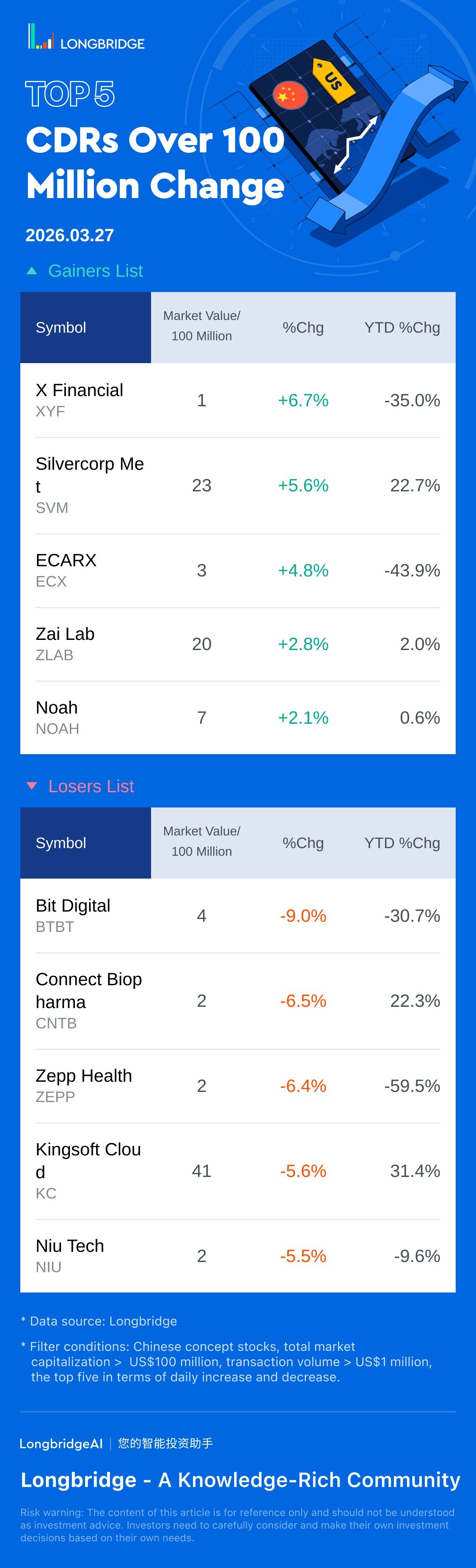 X Financial(XYF) rose 6.74%, with a trading turnover 1.1 Million USD, and a year-to-date fell 35%.