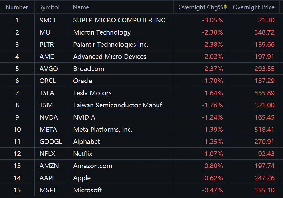 Big tech stocks fell in overnight trading. SMCI down 3%; Micron, Palantir, AMD, Broadcom down over 2%; Oracle, Tesla, Nvidia down over 1%.