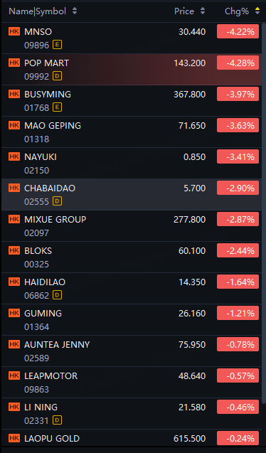 Pop Mart, MNSO, Maogeping down 4%; Chabaidao, Mixue down 3%; Bloks, Haidilao down 2%; Guming down 1%.