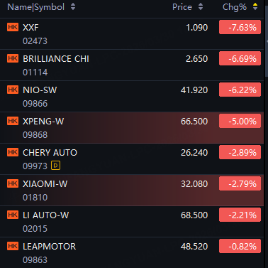 EV stocks fell in Hong Kong. Nio down 6%; XPeng down 5%; Xiaomi down 3%; Li Auto fell 2%; Leapmotor fell 1%.