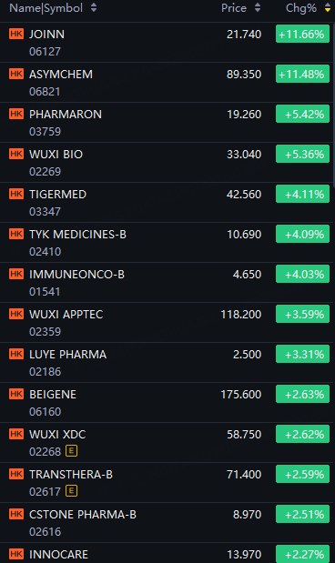 HK Movers | Biotech Stocks Jump. JOINN up 12%; Asymchem up 11%; Wuxi Bio up 5%