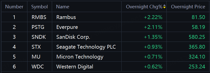 Storage shares rebounded in overnight trading. Rambus, Everpure up over 2%; SanDisk, Seagate Tech up around 1%.