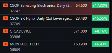CSOP Samsung Electronics Daily 2x Leveraged Product up 17%; CSOP SK Hynix Daily 2x Leveraged Product up 16%; GigaDevice up 8%.