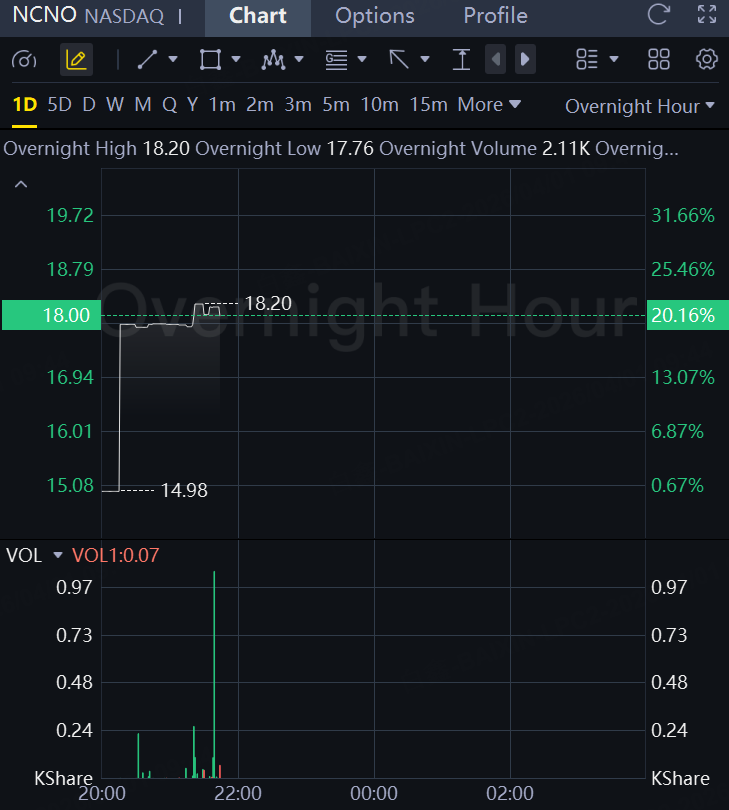 Shares of nCino were trading 20% higher in overnight trading as it had fourth-quarter earnings per share of 7 cents on revenue of $149.7 million. In the year-ago quarter, the company reported a loss per share of 16 cents on revenue of $141.4 million.