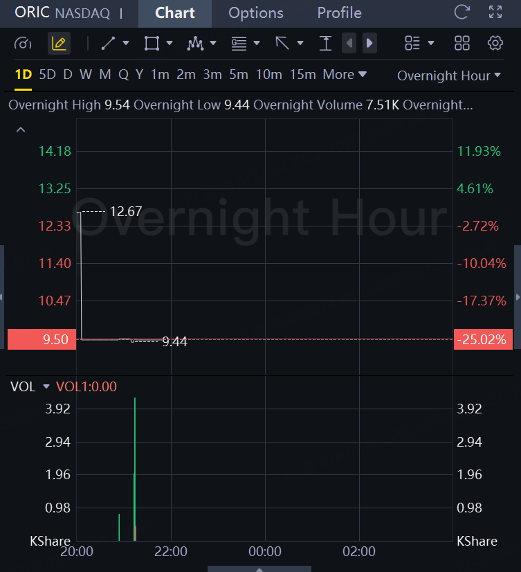 Oric Pharmaceuticals Inc. fell 25% in overnight trading after the company announced the selection of rinzimetostat’s recommended Phase 3 dose in combination with darolutamide for its Himalayas-1 trial.