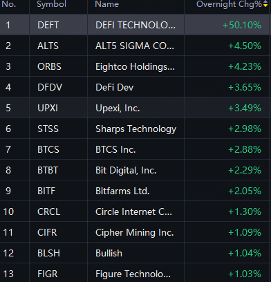 Crypto Shares Rally. DEFT up 50%; ALTS and ORBS up 4%; DeFi and UPXI up 3%.