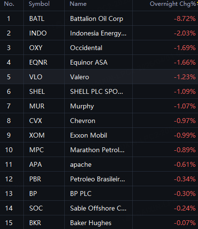 Oil stocks dropped in overnight trading. Battalion Oil down 9%; Indonesia Energy and Occidental down 2%.