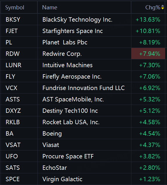 Space stocks jumped in morning trading. BlackSky rose 14%; Starfighters Space rose 10%; Planet Labs and Redwire rose 8%; Intuitive Machines, Firefly Aerospace, and Fundrise Innovation Fund (VCX) rose 7%; AST SpaceMobile, Destiny Tech100 (DXYZ)$, Rocket Lab, and Boeing rose 5%;