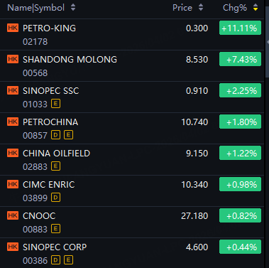 PETRO-KING up 11%; Shandong Molong up 7%; Sinopec SSC, PetroChina up 2%; CNOOC, CIMC Enric up 1%.