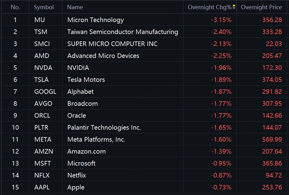 Big tech stocks fell in overnight trading. Micron down 3%; TSMC, SMCI, AMD, Nvidia, Tesla, Alphabet down around 2%; Palantir, Meta, Amazon down over 1%.
