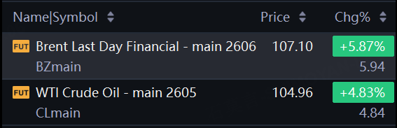 Brent oil futures rose 5.87% to $107.1 a barrel.