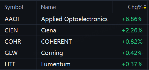 Optical communication stocks rallied in morning trading. Applied Optoelectronics rose 7%; Ciena rose 2%.