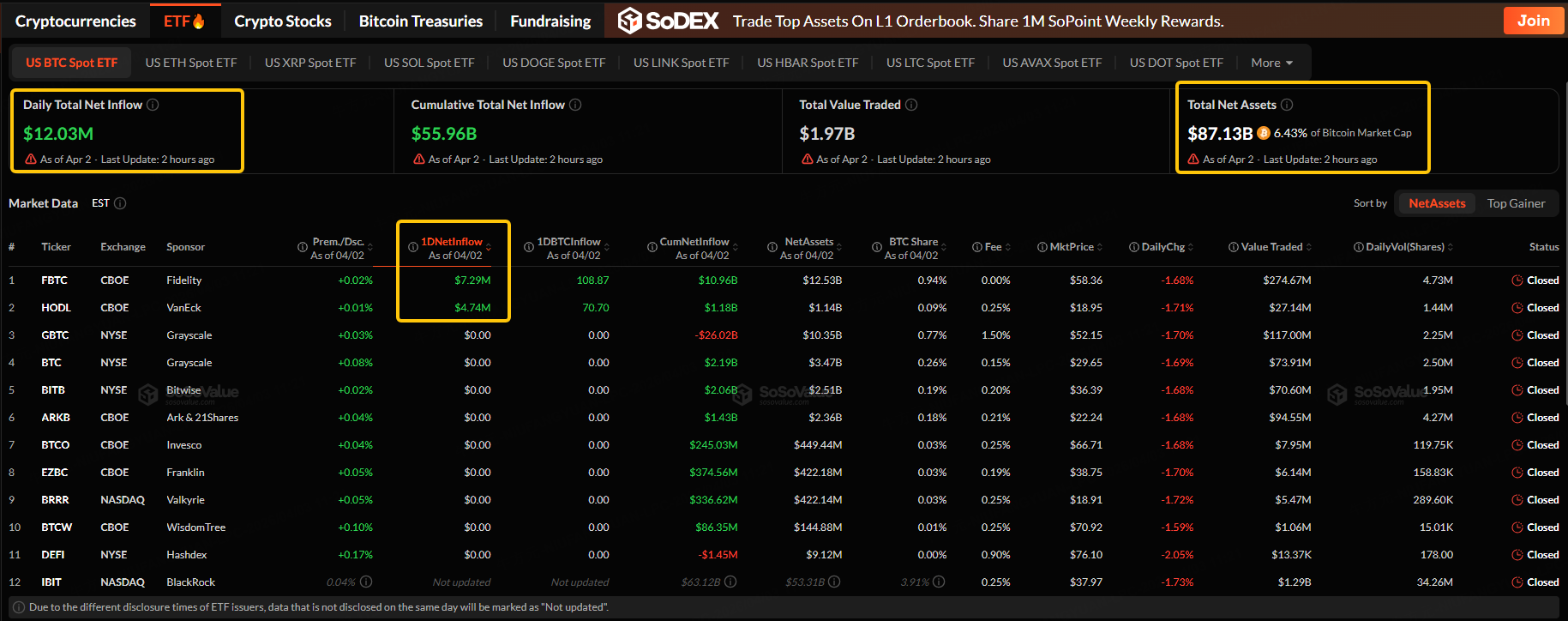 The Bitcoin spot ETF with the highest net inflow was Fidelity Wise Origin Bitcoin Fund, with a net inflow of $7.29 million, according to SoSoValue.