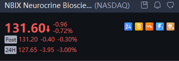 U.S.-listed shares of Neurocrine Biosciences fell 3% and Soleno Therapeutics rose 20% in overnight trading.