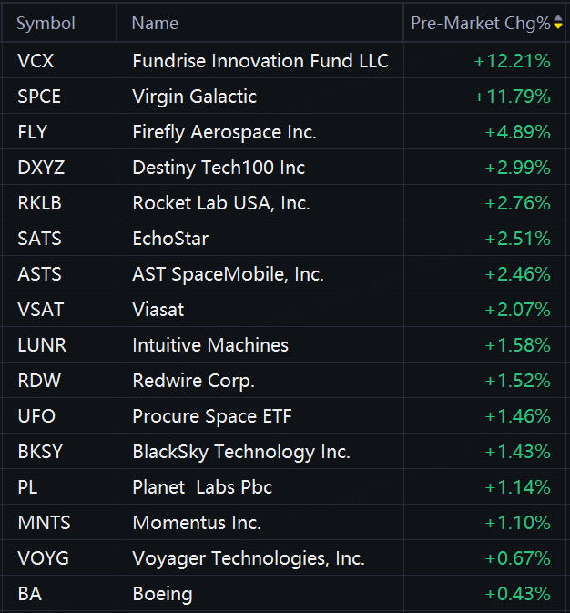 Space stocks and funds jumped in premarket trading. Fundrise Innovation Fund and Virgin Galactic rose 12%; Firefly Aerospace rose 5%; Destiny Tech100, Rocket Lab, EchoStar, and AST SpaceMobile rose 3%; Viasat, Intuitive Machines, Redwire, and Procure Space ETF rose 2%.