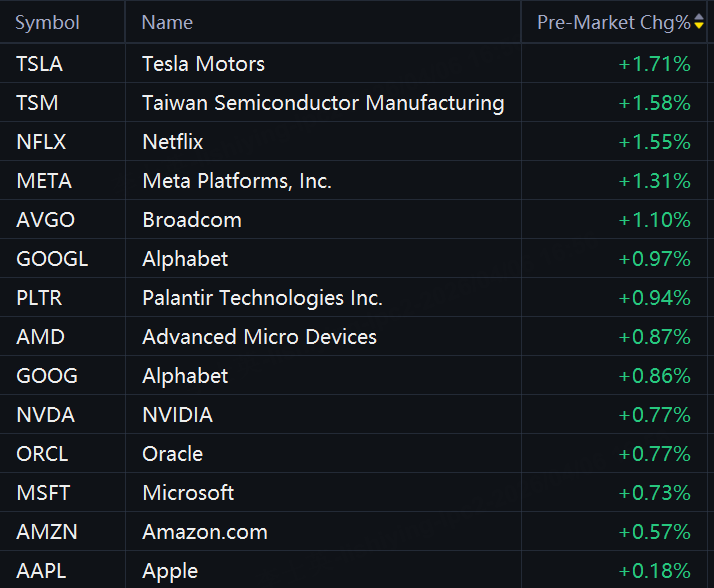 Big tech stocks rose in premarket trading. $Tesla(TSLA), TSMC, and Netflix rose 2%; Meta, Broadcom, and Alphabet rose 1%.