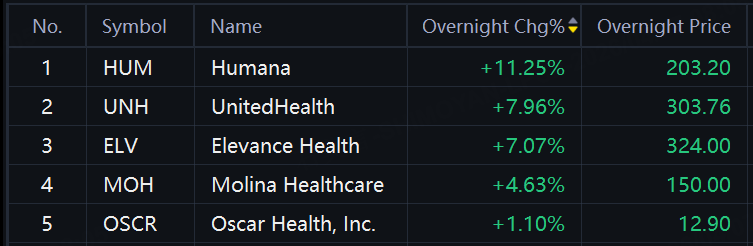 Insurance stocks surged in overnight trading. Humana up over 11%; UnitedHealth up 8%; Elevance Health up 7%. The U.S. government said on Monday it would raise payments to private insurers offering Medicare Advantage plans to older adults in 2027 by 2.48% on average, an increase from the near-flat change it proposed in January, driving insurer shares up sharply.