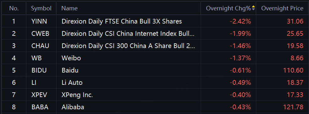 China A50 index futures fell 0.61%. Chinese ADRs and ETFs fell in overnight trading with YINN, CWEB down around 2%; CHAU, WB down over 1%.