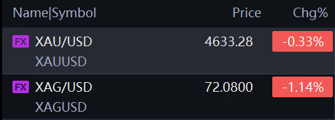 Spot gold fell 0.33% to $4,633.28 per ounce; spot silver fell 1.14% to $72.08 per ounce.
