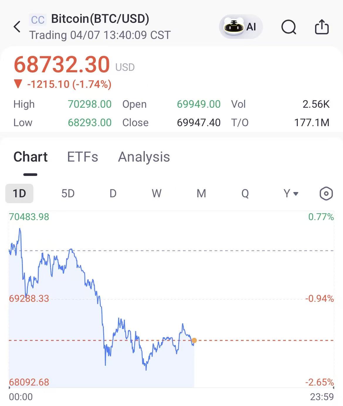 Bitcoin fell 1.74% to $68,732.3