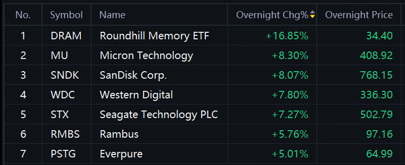 24H | Storage Shares Extend Rally. Roundhill Memory ETF up 17%; Micron, SanDisk, Western Digital up Around 8%; Seagate Tech up over 7%