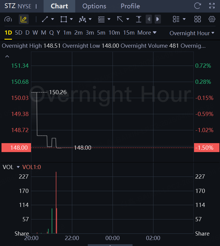 Constellation Brands logged lower revenue in its latest quarter as demand for its beer, wine and spirits remains weak. Constellation shares fell 1.5% in overnight trading.