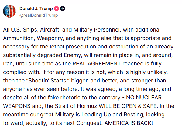 Trump: All U.S. Ships, Aircraft, and Military Personnel Will Remain In Place In, And Around, Iran