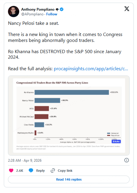 Rep. Ro Khanna (D-Calif.) has emerged as the top-performing congressional stock trader in AI-related investments, outperforming the S&P 500 and surpassing Nancy Pelosi, according to data highlighted by Anthony Pompliano on Wednesday.