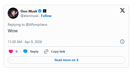 The post quickly gained traction online, drawing a brief response from Tesla Inc. (NASDAQ:TSLA) and SpaceX CEO Elon Musk, who replied: "Wow."
