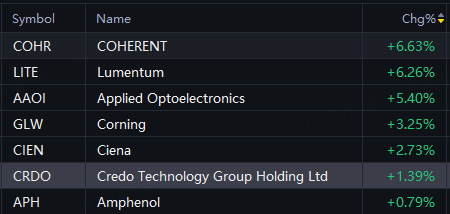 Coherent up 7%; Lumentum up 6%; AAOI up 5%; Ciena, Corning up 3%; Credo Technology up 1%.