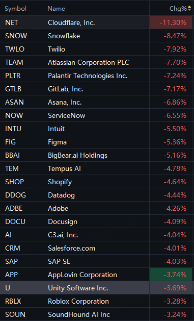 AI Software Shares Drop; Cloudflare down 11%; Snowflake, Atlassian down 8%; Palantir, GitLab, ServiceNow down 7%