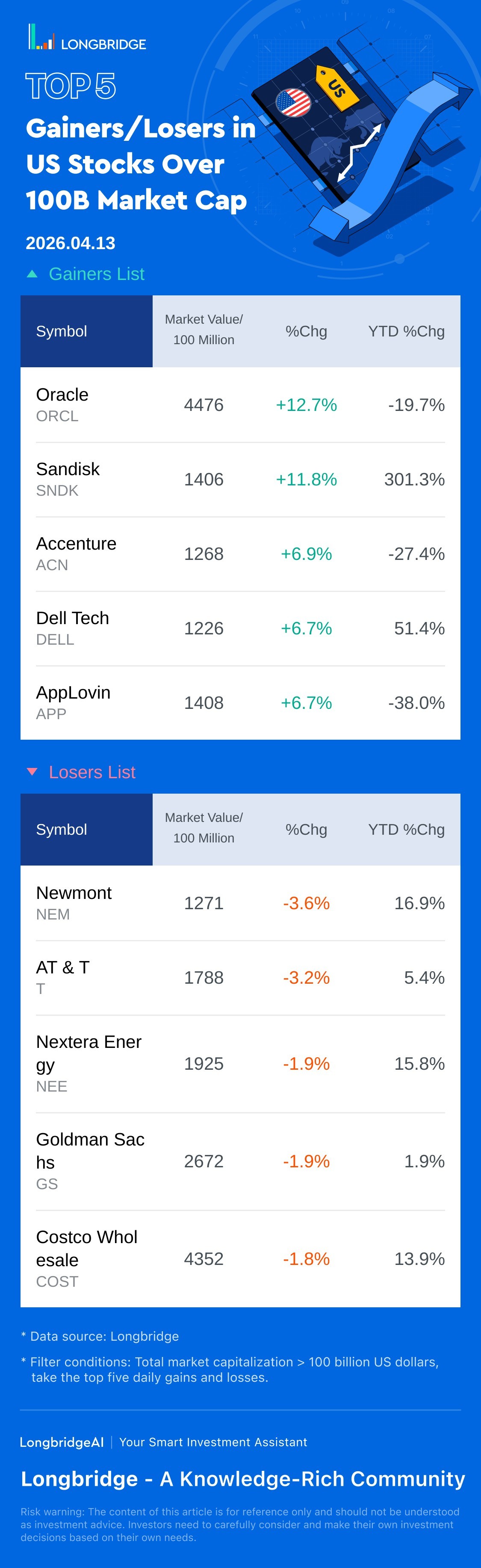 Top 5 US Stock Gainers/Losers (>100B) (4.13)