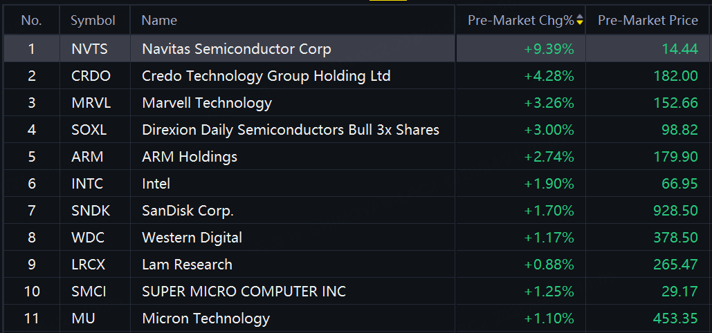 Chip, storage shares jumped in premarket trading. Navitas Semiconductor up over 9%; Credo up 4%; Marvell, ARM up around 3%; Intel, SanDisk up about 2%.