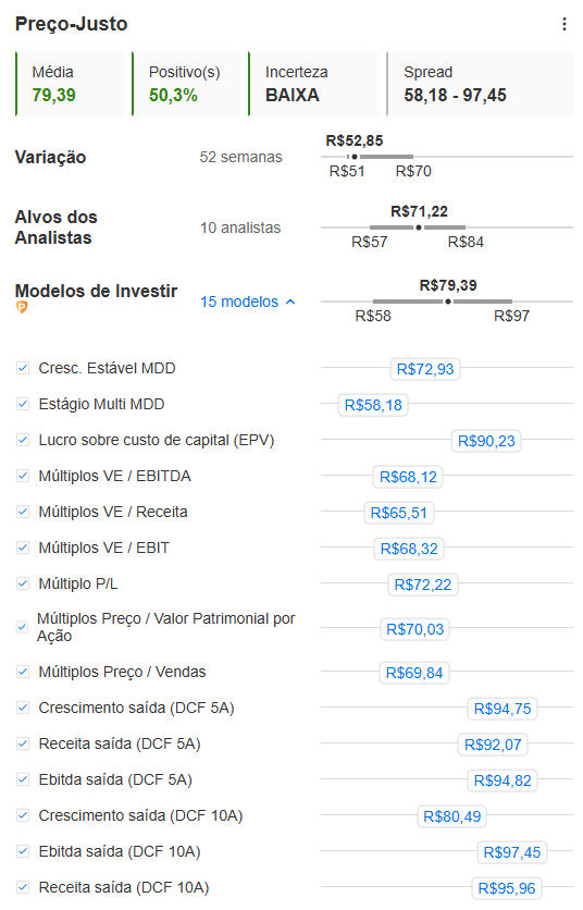 Com preço-alvo estimado em R$79,39 para as ações ordinárias da mineradora, o InvestingPro conta com 15 modelos de valuation para a Vale, que vão de R$58,18 a R$97,45. O modelo é mais otimista do que a média de 10 analistas, mas eles também enxergam a ação descontada, com um alvo estimado em R$71,22.