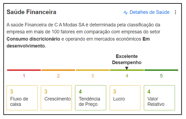 A pontuação geral de saúde financeira da C&A é de 3,30, acima da média de 2,75, considerada como ótima, com nota B.