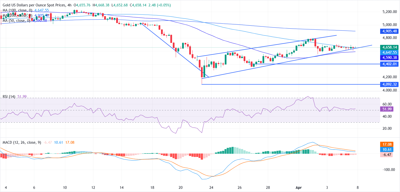 เส้นค่าเฉลี่ยเคลื่อนที่อย่างง่าย (SMA) 100 ช่วง ใกล้ $4,654 ยังคงทำหน้าที่เป็นแนวต้านเหนือศีรษะ โดยมีการปฏิเสธราคาซ้ำ ๆ ที่จำกัดความพยายามขึ้นราคา การทะลุผ่านระดับนี้อย่างต่อเนื่องอาจเปิดทางให้ราคาขยับขึ้นไปยังเส้น SMA 200 ช่วง ใกล้ $4,908