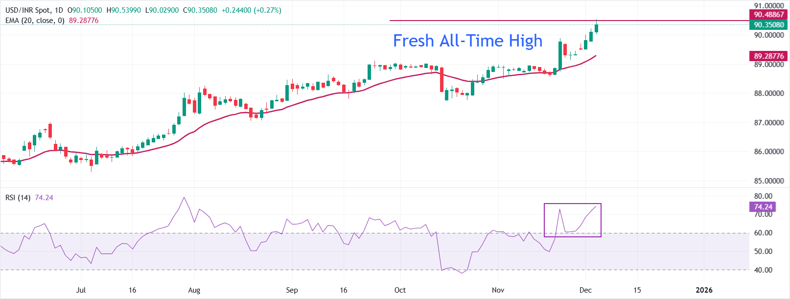 USD/INR พุ่งขึ้นใกล้ 90.50 ในวันพุธ เส้นค่าเฉลี่ยเคลื่อนที่แบบเอ็กซ์โพเนนเชียล (EMA) 20 วันยังคงเพิ่มขึ้น และราคายังคงอยู่เหนือเส้นนี้ ซึ่งเสริมสร้างแนวโน้มขาขึ้นในระยะสั้น