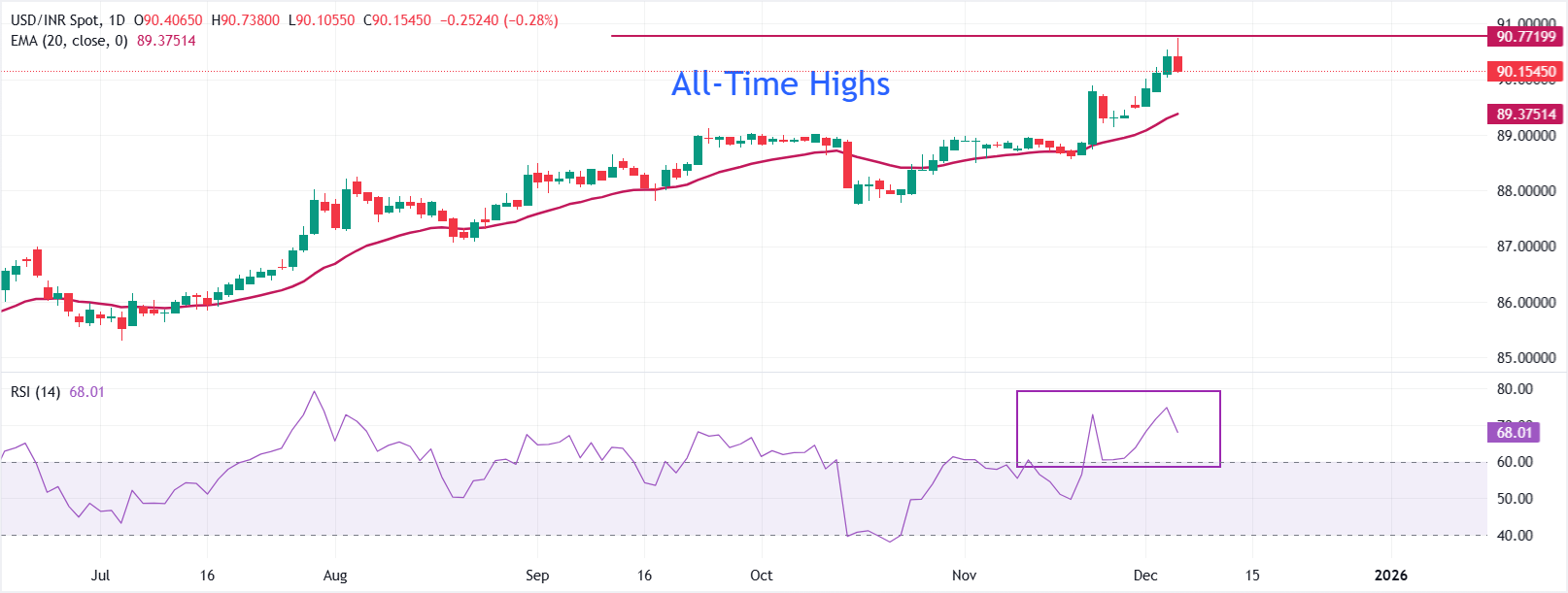 ก่อนหน้านี้ในวันนั้น คู่ USD/INR ทำระดับสูงสุดใหม่ที่ประมาณ 90.75 ขณะที่รูปีอินเดียยังคงเผชิญกับแรงกดดันจากการไหลออกของเงินทุนต่างประเทศจากตลาดหุ้นอินเดียอย่างต่อเนื่อง