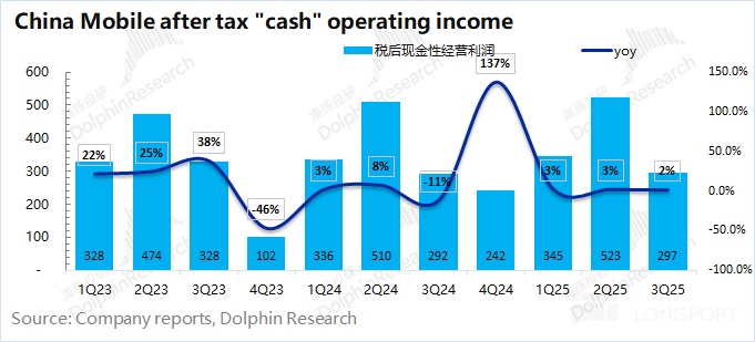 随着 5G 高投入期的收尾,中国移动的资本开支已经明显回落。由于当前公司资本开支逐步回落,而摊销折旧仍然较高,那么公司的现金性经营利润将比财报中的经营利润(税后约为 256 亿元)更高,公司实际上也是更加赚钱的。海豚君测算公司本季度税后现金性经营利润为 297 亿元,同比增长 2%。